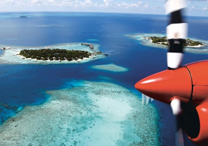 Nein nur innerhalb der Insel kann man rundum laufen, da alle Bungalows Privatstrände haben. Man reist mit dem Wasserflugzeug an.