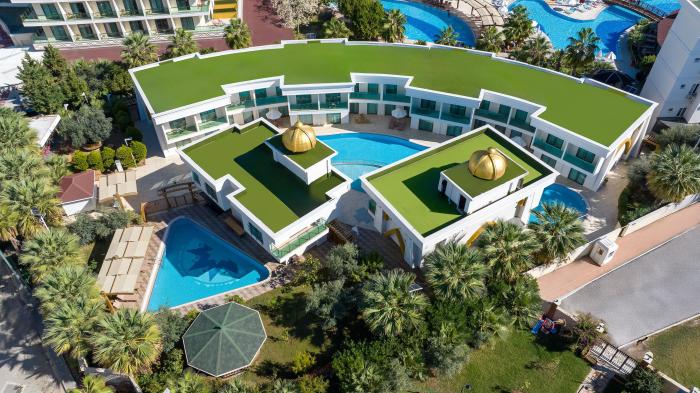 Majestätisch erheben sich die palastartigen Kuppeln des Hotels an der tiefblauen Türkischen Riviera. Weniger als 20 Kilometer trennen das einzigartig konstruierte Gebäude im gemütlichen Dorf Türkler von der quirligen türkischen Ferienhochburg Alanya. Die weitläufige Anlage bietet ihren Gästen neben vielen sonnenverwöhnten Plätzen, gleich 4 verschiedene Swimmingpools mitsamt Wasserrutschen und einem landestypischen Spa mit Türkischem Bad. Auch kulinarisch können sich Feinschmecker dank All-Inklusive-Angebotin einem orientalischen Buffetrestaurant, 5 internationalen A-la-Carte-Restaurants sowie einer Patisserie ganztägig verwöhnen lassen.