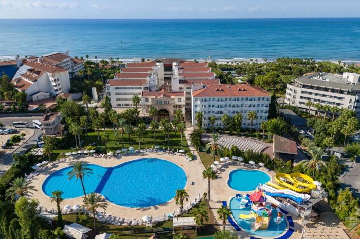 Nahe der beliebten Ferienregion Side an der Türkischen Riviera, liegt diese luxuriöse Hotelanlage. Neben seiner komfortablen Ausstattung und der unmittelbaren Nähe zum hauseigenen Sandstrand besticht das Resort zudem mit seiner ausgezeichneten Küche und vielfältigen Annehmlichkeiten. Urlauber schätzen vor allem den besonders aufmerksamen Service des Hotels. Mit viel Liebe zum Detail werden Gäste vom ersten bis zum letzten Tag verwöhnt. Besonders Familien genießen ihren Aufenthalt im kinderfreundlichen Hotel, das Betreuung und Kinderspielplatz bietet. Nur wenige Gehminuten von der Unterkunft entfernt befinden sich Einkaufs- sowie Unterhaltungsmöglichkeiten.