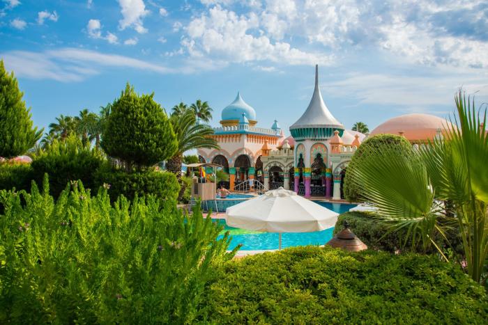 Reisende, die landestypisches Flair erleben und gleichzeitig in den Genuss der Türkischen Riviera kommen möchten, sind in diesem Hotel genau richtig. Dank osmanischer Architektur genießen Urlauber das charmante Ambiente der Anlage. Nicht nur der Baustil, auch die grüne, liebevoll gestaltete Gartenanlage lädt hierbei zum Träumen ein. Während Erwachsene am Pool und im Wellnesszentrum Erholung finden, dürfen sich die kleinen Gäste über ein aufregendes Unterhaltungsangebot freuen: Sei es der actionreiche Aquapark mit Piratenschiff und Wasserrutschen oder die hoteleigene Tennisschule, Platz zum Austoben gibt es im Resort genug. Die direkte Lage am malerischen Strand unterstreicht das Wohlfühl-Ambiente und ein Strand- sowie A-la-carte-Restaurant runden den Aufenthalt kulinarisch ab.