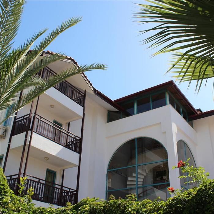 Das Aparthotel liegt im Grünen an der Türkischen Riviera direkt am türkisblauen Mittelmeer. Am hoteleigenen, gepflegten Strandabschnitt lässt sich Badespaß und Erholung pur erleben. Für die Gäste des Hauses stehen Sonnenliegen, Auflagen und Schirme kostenfrei zur Verfügung. In der charmant gestalteten Hotelanlage lässt es sich an 2 Pools mit separatem Kinderbecken und an der Poolbar bei einem erfrischenden Getränk entspannen.