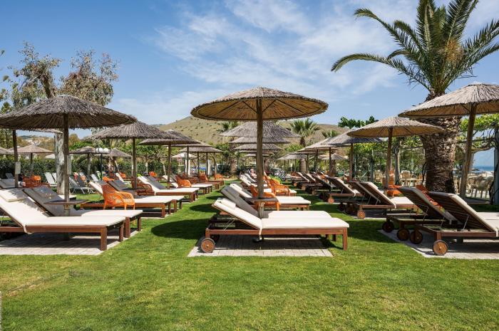 Dieses moderne Hotel verspricht einen unvergesslichen Urlaub auf Griechenlands größter Insel Kreta. Die üppig grüne Anlage in direkter Strandlage ist einem traditionellen Dorf aus mehreren zweigeschossigen Gebäuden mit geräumigen Zimmern und luxuriösen Suiten nachempfunden. Im Inneren erwartet die Gäste ein Mini Spa mit beheizbarem Pool und Sauna, ein gut ausgestattetes Fitnessstudio und das stilvolle Restaurant Knossos, wo zu den Hauptmahlzeiten leckere Buffets zur Auswahl stehen. An der hoteleigenen Strandbar können Urlauber kleinere Snacks und Cocktails beim Blick auf den wunderschönen Sandstrand und das türkisblaue Meer genießen. Für Spiel- und Sportbegeisterte stellt das Hotel den Golf-, Tennis- oder Beachvolleyballplatz zur Verfügung. Darüber hinaus gibt es für die kleineren Gäste einen Kinderspielplatz und separate Becken. Verschiedene musikalische Abendveranstaltungen runden den Urlaub ab und zählen zu den weiteren Highlights des Hotels.