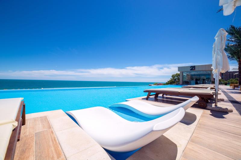 Das Hotel liegt nur ca. 20 m vom Sandstrand entfernt, im Herzen des malerischen bulgarischen Badeorts und internationalen Reiseziels Goldstrand. Restaurants, Bars und Nachtclubs finden die Gäste nach einem Fußmarsch von etwa 5 min. Die nächsten Anschlüsse an das öffentliche Verkehrsnetz sind zu Fuß in rund 10 min zu erreichen, und bis zum Aquapark sind es zu Fuß ca. 20 min. Warna selbst befindet sich rund 20 km vom Hotel entfernt, und bis zum Flughafen Warna sind es nur etwa 35 km. Das Hotel bietet 325 Zimmer und 6 Suiten auf 18 Etagen, die mit einem Aufzug erreichbar sind. Das mehrsprachige Personal an der Rezeption im Empfangsbereich steht zur Seite beim Ein- und Auschecken. Die Gäste des Hauses erhalten zur Begrüßung ein Willkommensgetränk. Eine Gepäckaufbewahrung, ein Safe, eine Wechselstube und ein Geldautomat gehören zur Einrichtung der Unterbringung. WLAN ist in den öffentlichen Bereichen (ohne Gebühr) verfügbar. Hilfestellung bei der Buchung von Ausflügen wird am Tourdesk geboten. Ein Supermarkt und ein Souvenirshop und andere Geschäfte können zum Einkaufen und Bummeln genutzt werden. Zudem gibt es einen Spielplatz für kleine Gäste. Zu den weiteren Einrichtungen des Hotels zählen ein Zeitungskiosk, ein TV-Raum und ein Spielzimmer. Bei einer Anreise mit dem Auto können die Gäste dieses in einer Garage oder auf dem Parkplatz parken. Unter den weiteren Leistungen finden sich ein Babysitterservice, eine Kinderbetreuung, medizinische Betreuung, ein Transferservice, ein Zimmerservice, ein Weckdienst, ein Wäscheservice, ein Friseur, ein Pagenservice, ein Hotelarzt und ein eigener Shuttlebus. Zur Erkundung der Umgebung bietet ein Fahrradverleih die notwendige Ausrüstung. Im Geschäftsbereich (Business-Center) sind Projektor und Flipchart/Stifte vorhanden. Die Kongressbetreuung bietet Unterstützung bei allem, was die Organisation von Veranstaltungen betrifft. Vorträge, Präsentationen oder Tagungen können in einem der 10 Konferenzräume abgehalten werden. Für angenehmes Raumklima in den Zimmern sorgen eine Klimaanlage und eine individuell steuerbare Heizung. Ein Balkon mit Meerblick in den meisten Unterkünften lädt zum Verweilen ein. In den mit Teppichböden ausgestatteten Zimmern steht ein Doppelbett, ein Queensize-Bett, ein Kingsize-Bett oder ein Sofabett bereit. Kinderbetten werden auf Anfrage kostenlos bereitgestellt. Außerdem sind ein Safe, eine Minibar und ein Schreibtisch verfügbar. Auch ein Minikühlschrank und eine Tee-/Kaffeemaschine sind vorhanden. Besten Urlaubskomfort bieten ein Telefon mit Direktwahl, ein TV-Gerät mit Satelliten-/Kabelempfang und WiFi (ohne Gebühr). Die Gäste finden Hausschuhe in ihrer Unterkunft. Die Badezimmer sind ausgestattet mit einer Dusche, einer Badewanne und einem Bidet. Für den täglichen Gebrauch stehen ein Haartrockner, ein Kosmetikspiegel, Bademäntel und ein Telefon zur Verfügung. Für besonderen Komfort in den Badezimmern sorgen Kosmetikartikel. Außerdem sind 5 rollstuhlgerechte Zimmer mit barrierefreiem Badezimmer buchbar. Das Haus bietet Nichtraucherzimmer. Es stehen verschiedene gastronomische Einrichtungen zur Auswahl, wie ein Café, eine Bar, ein Pub und eine Lobbybar. Den Gästen steht ein Nichtraucherrestaurant mit Klimaanlage, Kinderhochstühlen und einem separaten Raucherbereich zur Verfügung. Das Haus bietet als buchbare Verpflegungsleistungen Übernachtung inkl. Frühstück, Halbpension und Vollpension. Ein kontinentales Buffetfrühstück garantiert einen guten Start in den Tag. Mittags und abends gibt es die Wahl zwischen Buffet, à la carte und Menü. Glutenfreie Mahlzeiten, vegetarische Gerichte und koschere Kost werden auf Wunsch zubereitet. Eine besondere Attraktion ist das Showcooking. Die Getränkekarte beinhaltet eine Vielfalt alkoholischer und alkoholfreier Getränke sowie internationale Marken. Folgende Kreditkarten werden akzeptiert: American Express, Visa und MasterCard.
